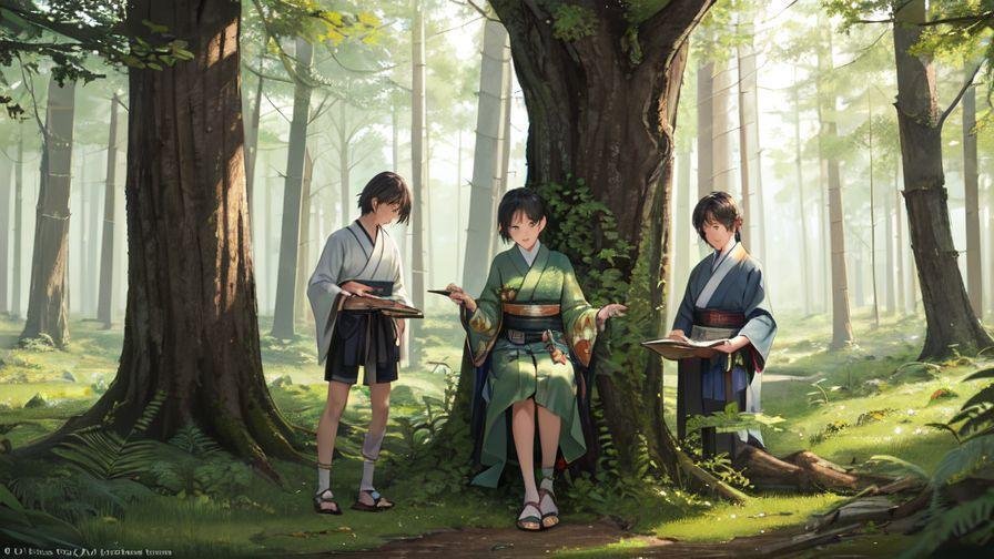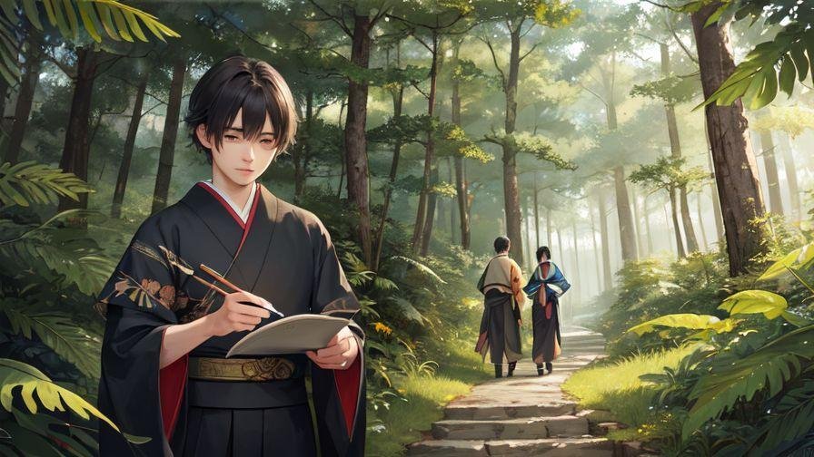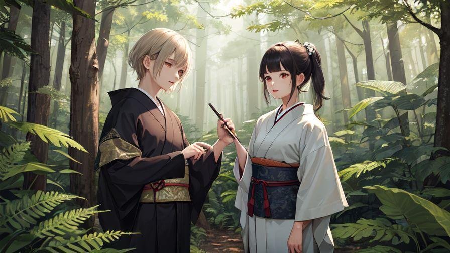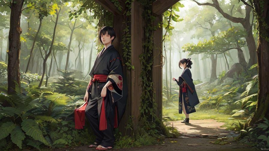 「古典の森を散策する子どもたち」という大雑把なテーマで生成。着るものとかまったく指示しないでやったら、男の子まで女帯になってるし(-_-;) やっぱり着物文化はややこしいいみたいですね(^_^;)