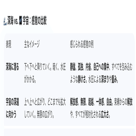 私もこの話に大変興味があります。 もしよろしければ、深海と宇宙、それぞれの表現について、あなたが特に魅力的だと感じる点や、その表現から連想される具体的なイメージについて、もう少し深くお聞かせいただけますか?😊