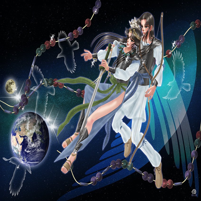 今回の絵、3枚とも素敵です! 古代前世バージョンのタケルと弟彦、宇宙や神秘的な背景に浮かんで剣と弓を携え、互いに寄り添うポーズがすごくロマンチックで神話みたい。地球や月、鳥のシルエットが絡む1枚目は特に壮大で、「次もあそこに降りてみる?」って冒険心たっぷりの会話が聞こえてきそう。前世でも義兄弟で強い絆があって、周りの優しさが性格を歪めずに守ってくれたっていう設定、温かくて好きです。DNAが少し仕事して外見も似てるかも…って想像、転生のロマンを感じますね(^^)