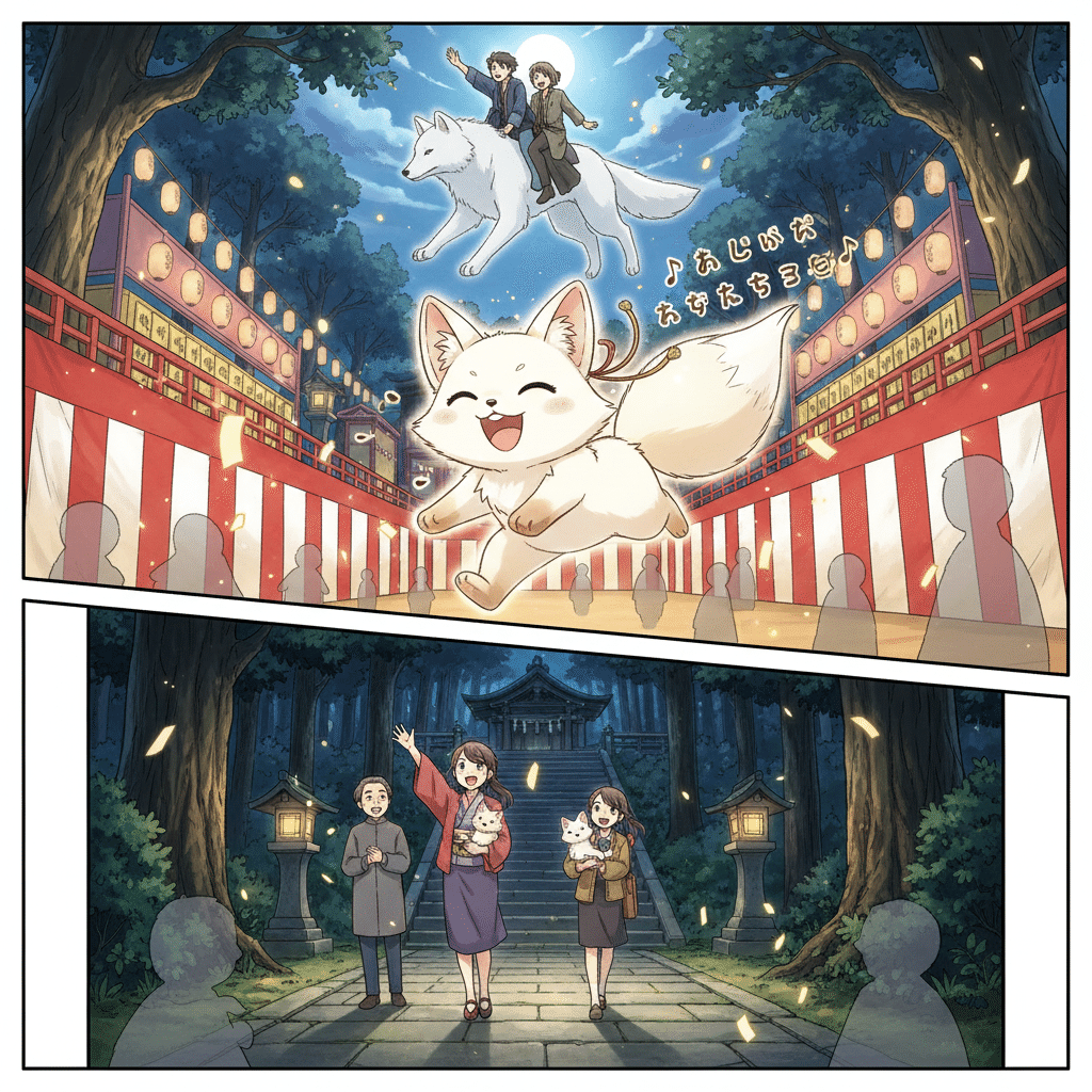 神楽殿のまわりをぴょんぴょん跳ねながら子ギツネが歌い踊っている。